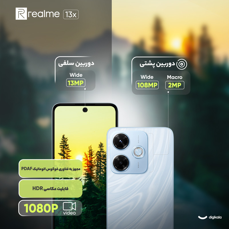 گوشی Redmi 13X یکی از میانردههای تازهنفس شیائومی و نسخه ارتقا یافته سری پرطرفدار Redmi 13 است که با ترکیبی هوشمند از طراحی جذاب، نمایشگر باکیفیت و سختافزار متعادل، توجه بسیاری از کاربران را جلب کرده است. این گوشی با بدنهای شیشهای و فریم پلاستیکی، ظاهری مدرن و خوشدست دارد و گواهی IP53 مقاومت در برابر گردوغبار و پاشش آب، دوام آن را در استفاده روزمره تضمین میکند. نمایشگر بزرگ 6.79 اینچی از نوع IPS LCD با نرخ نوسازی 90 هرتز و وضوح Full HD+، تجربهای روان و چشمنواز در تماشای محتوا و بازیها ارائه میدهد. شیائومی برای Redmi 13X از تراشه Helio G91 Ultra استفاده کرده که عملکردی سریع و روان را در کارهای روزمره و اجرای بازیهای سبک فراهم میسازد. دوربین اصلی این گوشی با رزولوشن ۱۰۸ مگاپیکسلی، نقطه قوت اصلی آن است که عکسهایی با جزئیات بالا و رنگهای طبیعی ثبت میکند، دیگر دوربین هم یک دوربین ماکرو ۲ مگاپیکسلی است که برای ثبت سوژههای نزدیک کاربرد دارد. دوربین سلفی ۱۳ مگاپیکسلی هم کیفیت قابلقبولی برای تماس و عکسهای روزمره دارد. و در آخر باتری قدرتمند ۵۰۳۰ میلیآمپرساعتی با پشتیبانی از شارژ سریع ۳۳ واتی، Redmi 13X را به گزینهای ایدهآل برای کاربران پرمصرف تبدیل کرده است. در مجموع، این گوشی با سیستمعامل Android 14، ترکیبی از عملکرد، طراحی و قیمت مناسب را ارائه میدهد.
