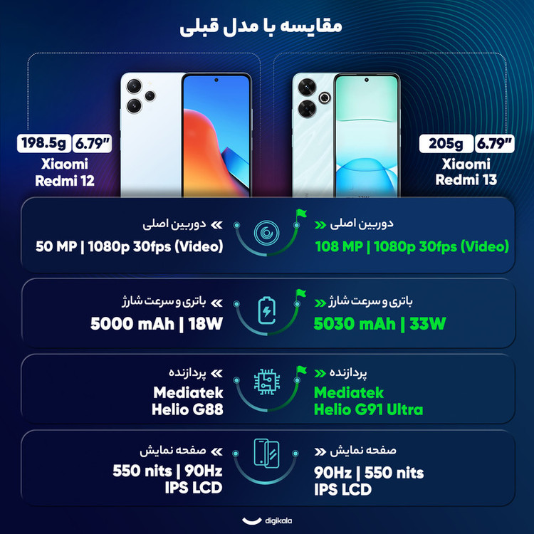 گوشی موبایل شیائومی مدل Redmi 13 محصولی مقرون به صرفه با قابلیتهای چشمگیر در رده میانردهها است. این گوشی با نمایشگر 6.79 اینچی IPS LCD و رزولوشن Full HD+، تجربه بصری خیرهکنندهای را ارائه میدهد. نرخ نوسازی 90 هرتز، روان بودن حرکات را تضمین میکند. تراشه MediaTek Helio G91 Ultra به همراه هشت هسته پردازنده، قدرت پردازشی مناسبی برای اجرای اپلیکیشنها و بازیها فراهم میکند. دوربین اصلی 108 مگاپیکسلی با قابلیت فوکوس خودکار این گوشی، عکسهای واضح و با جزئیات بالا را به شما هدیه میدهد. دوربین ماکرو دو مگاپیکسلی نیز برای عکاسی از سوژههای نزدیک مناسب است. دوربین سلفی 13 مگاپیکسلی موجود در گوشی برای عکاسی خودنگاره مناسب است. باتری 5030 میلیآمپر ساعتی با پشتیبانی از شارژ سریع 33 واتی، شارژدهی طولانیمدتی را فراهم میکند. این گوشی با دو سیمکارت و حافظه داخلی 128 گیگابایت و رم شش گیگابایت عرضه میشود که امکان افزایش آن با کارت microSD نیز وجود دارد. این گوشی با طراحی زیبا، وزن 205 گرمی و ضخامت 8.3 میلیمتری، انتخابی مناسب برای کاربران جویای یک گوشی کارآمد و خوشقیمت است. همچنین این نسخه مجهز به فناوری ارتباطی NFC است.