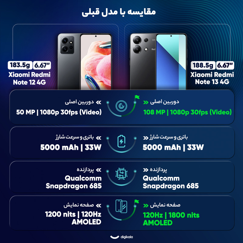 سری Redmi گوشیهای هوشمند میانرده شیائومی تا به امروز توانستهاند با بهره بردن از مشخصات فنی قدرتمند و البته قیمتی مقرون بهصرفه، عملکرد بسیار درخشانی را از خود به جای بگذارند و شیائومی Redmi Note 13 یکی از این میانردههای دوست داشتنی است که در برخی از مشخصات فنی در نظر گرفته شده امکاناتی در حد و اندازه یک پرچمدار را در اختیارتان قرار میدهد. این گوشی به صفحهنمایش با ابعاد 6.67 اینچ و رزولوشن 1080×2400 پیکسل از نوع امولد با نمایش 395 پیکسل در هر اینچ مجهز شده است. نرخ بروزرسانی 120 هرتز و حداکثر روشنایی 1800 نیت (nits) صفحهنمایش سبب شده تا عملکرد روان و بدون لگ را شاهد باشید و حتی زیر تابش مستقیم نور خورشید هم وضوح تصویر بسیار خوبی را در اختیارتان قرار میدهد. یک سنسور دوربین اصلی 108 مگاپیکسل در کنار سنسور 8 مگاپیکسل فوقعریض و سنسور 2 مگاپیکسل ماکرو در قسمت پشتی در نظر گرفته شده است. حضور سنسور دوربین اصلی قدرتمند سبب شده تا عملکرد بسیار خوبی را در زمینه عکاسی نور روز و نور شب شاهد باشید. بریدگی دایرهای شکل ناچ در قسمت بالایی و مرکزی صفحهنمایش، سنسور دوربین سلفی را در خود جای داده است. حضور پردازنده شش نانومتری Qualcomm SM6225 Snapdragon 685 هم سبب شده تا Redmi Note 13 در اجرای بازیهای محبوب و نرمافزارهای کاربردی، عملکردی کاملا قابل قبولی داشته باشد. باتری با میزان ظرفیت 5000 میلیآمپرساعت در کنار فناوری شارژ سریع 33 وات از دیگر مشخصات در نظر گرفته شده هستند. در محموع باید بگوییم که اگر به دنبال گوشی میانرده خوش قیمتی هستید که در برخی از مشخصات فنی در نظر گرفته شده حتی توانایی ارائه عملکردی در حد و اندازه یک پرچمدار را داشته باشد، شیائومی Redmi Note 13 میتواند یکی از گزینههای بسیار مناسب برای شما باشد.