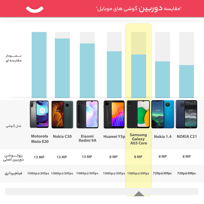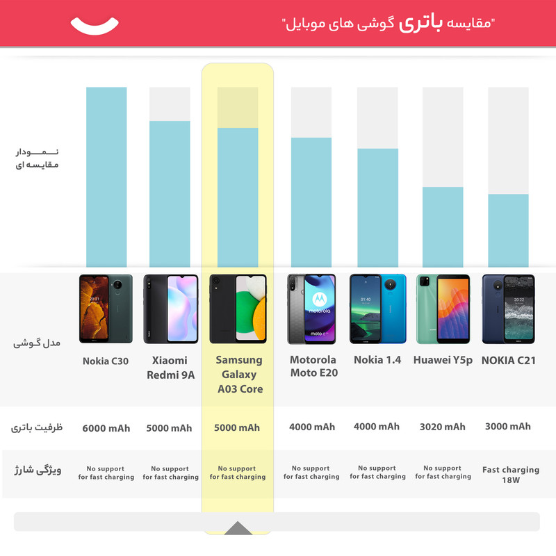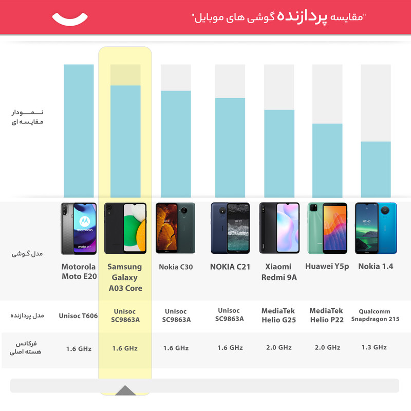 بدون شک سامسونگ یکی از موفقترین برندهای فعال در حوزه گوشیهای هوشمند است که گوشیهای میانرده سری A و M این شرکت تا به امروز توانستهاند در کنار عملکرد خوب و قیمت مقرون بهصرفه، فروش بسیار خوب و چشمگیری داشته باشند. یکی از جدیدترین گوشیهای هوشمند میانرده این شرکت، گوشی موبایل سامسونگ مدل Galaxy A03 Core SM-A032F/DS دو سیم کارت ظرفیت 32 گیگابایت و رم 2 گیگابایت است که با توجه به قیمت در نظر گرفته شده، به مشخصات فنی مناسب و قابل قبولی مجهز شده است. Galaxy A03 Core SM-A032F/DS به صفحهنمایش با ابعاد 6.5 اینچ و رزولوشن 720×1600 پیکسل از نوع PLS TFT مجهز شده است. صفحهنمایشی که در هر اینچ توانایی نمایش 270 پیکسل را دارد. در قسمت پشتی تنها یک سنسور با رزولوشن 8 مگاپیکسلی و در قاب جلویی هم سنسور دوربین سلفی با رزولوشن 5 مگاپیکسل در نظر گرفته شده است. دوربین قسمت پشتی هم توانایی ضبط ویدیو با حداکثر کیفیت 1080p و سرعت 30 فریم در ثانیه را دارد. در بخش مشخصات سختافزاری هم این گوشی میانرده به پردازنده Unisoc SC9863A با معماری 28 نانومتری مجهز شده است. پردازندهای که با توجه به توانایی ارائه حداکثر فرکانس کاری 1.6 گیگاهرتز، عملکرد مناسب و قابل قبولی در فعالیتهای روزمره و البته بازیهای سبک دارد. لازم به ذکر است که سیستم عامل پایه Android 11 برای سامسونگ گلكسی در نظر گرفته شده است. باتری مناسب و قدرتمند با میزان ظرفیت 5000 میلیآمپرساعت هم سبب شده تا Galaxy A03 Core SM-A032F/DS به ازای هر بار شارژ 100 درصدی، طول عمر مفید (زمان آماده بهکار) دو روز را برای استفاده معمولی ارائه کند.