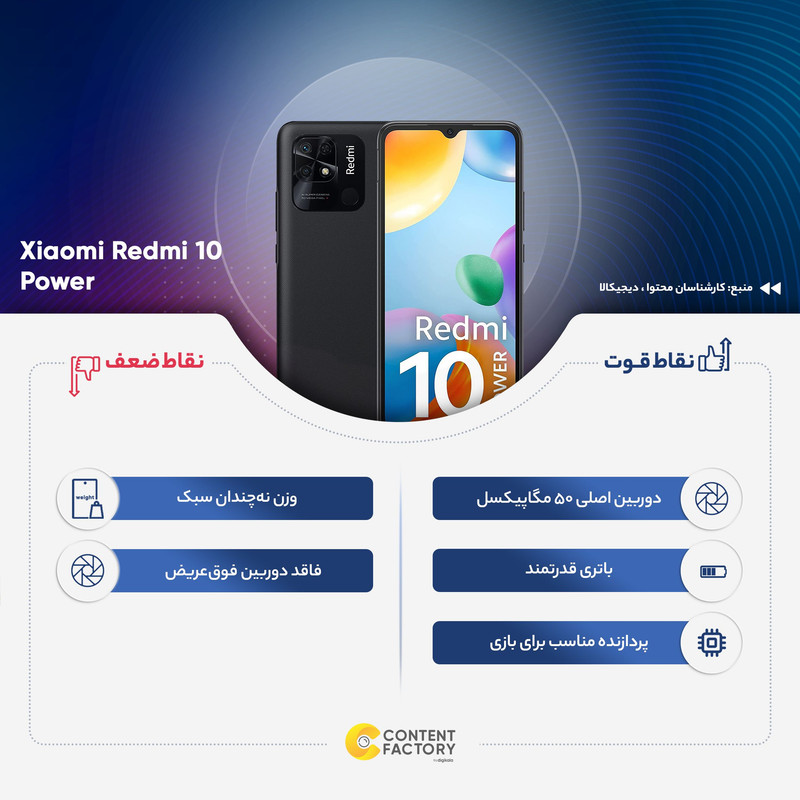 اگر شما هم به دنبال خرید گوشی هوشمند اقتصادی هستید که در کنار قیمت مناسب، از مشخصات فنی قابل قبولی بهره برده باشد که در فعالیتهای روزانه عملکرد خوبی را ارائه کند، گوشیهای سری Redmi شیائومی میتوانند انتخاب بسیار مناسبی برای شما باشند. Redmi 10 Power یکی از این گوشیهای هوشمند اقتصادی است که در نگاه اول از نظر طراحی چندان تفاوتی با مدل Redmi 10C ندارد، اما باید بدانید که Redmi 10 Power در برخی از موارد، از مشخصات فنی قدرتمندتری به نسبت Redmi 10C بهره برده است. Redmi 10 Power به صفحهنمایشی با ابعاد 6.7 اینچ و رزولوشن 720×1650 پیکسل از نوع IPS مجهز شده که توانایی نمایش 269 پیکسل در هر اینچ و حداکثر روشنایی 400 نیت (nits) را دارد و در نتیجه وضوح تصویر قابل قبولی را در شرایط نوری متنوع ارائه میکند. در قسمت پشتی این گوشی شاید خبری از سنسور دوربین فوق عریض یا همان ultrawide نباشد، اما حضور سنسور عریض 50 مگاپیکسل سبب شده تا Redmi 10 Power در بین گوشیهای هوشمند اقتصادی در این بازه قیمتی، عملکرد بسیار خوبی در بخش سنسور دوربین داشته باشد. سنسور دوربین 2 مگاپیکسل از نوع سنجش عمق هم این گوشی را همراهی میکند. برای دوربین سلفی هم سنسور با رزولوشن 5 مگاپیکسل در نظر گرفته شده که برای ثبت تصاویر در نور روز و بهخصوص برقراری تماسهای تصویری، عملکرد کاملا قابل قبولی دارد. در بخش مشخصات سختافزاری هم این گوشی به پردازنده اسنپدراگون 680 4G شرکت کوالکام مجهز شده. پردازندهای که در اجرای بازی و نرمافزارهای محبوب و کاربردی، توقعاتی بیش از یک گوشی اقتصادی را برآورده میکند. Redmi 10 Power به باتری قدرتمند با میزان ظرفیت 6000 میلیآمپر ساعت مجهز شده که بهراحتی در شرایط استفاده معمولی به ازای هر بار شارژ صد درصدی، طول عمر مفید (زمان آماده بهکار) دو روز و حتی بیشتر را ارائه میکند. در مجموع باید بگوییم که Redmi 10 Power در جایگاه یک گوشی اقتصادی با توجه به مشخصات در نظر گرفته شده همچون، سنسور دوربین عریض قدرتمند، پردازنده بسیار مناسب و باتری قدرتمند، میتواند یکی از بهترین انتخابهای ممکن برای شما باشد.
