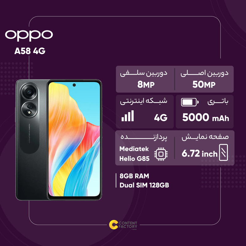 گوشیهای میانرده به دلیل قیمت مقرون بهصرفه، طرفداران بسیار در بین کاربران دارند. برند اوپو هم در این زمینه توانسته است محصولات متنوعی را روانه بازار کند که گوشی موبایل اوپو مدل A58 4G یکی از این میانردههای مقرون بهصرفه است که به نسبت قیمت در نظر گرفته شده، از مشخصات فنی مناسب و قابل قبولی بهره برده است. صفحهنمایش 6.72 اینچ این گوشی با رزولوشن 1080×2400 پیکسل و نمایش 392 پیکسل در هر اینچ، وضوح تصویر بسیار خوب و کاملا قابل قبولی را در شرایط نوری متنوع ارائه میکند. یک دوربین اصلی 50 مگاپیکسل در کنار دوربین 2 مگاپیکسل سنجشعمق در قسمت پشت این گوشی قرار گرفتهاند که برای ثبت تصاویر با کیفیت مناسب و قابل قبول در حد و اندازه یک گوشی میانرده، میتوانید روی دوربین اصلی این گوشی حساب باز کنید. دوربین سلفی 8 مگاپیکسل هم در نور روز عملکرد قابل قبولی دارد، اما برای عکاسی در نور شب چندان نباید حسابی روی این سنسور دوربین سلفی باز کنید. اوپو A58 به پردازنده میانرده هلیو G85 شرکت مدیاتک مجهز شده که توانایی ارائه عملکرد قابل قبولی در اجرای برنامههای کاربردی را دارد. باتری با میزان ظرفیت 5000 میلیآمپرساعت هم سبب شده تا به ازای هر بار شارژ صد درصدی در حالت استفاده معمولی، شاهد زمان آماده بهکار یک و نیم روز باشید. در مجموع باید بگوییم که اوپو A58 4G با توجه به مشخصات و قیمت در نظر گرفته شده، میتواند گزینه مناسبی در بین گوشیهای میانرده این بازه قیمتی باشد.