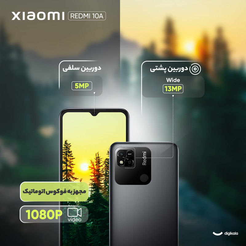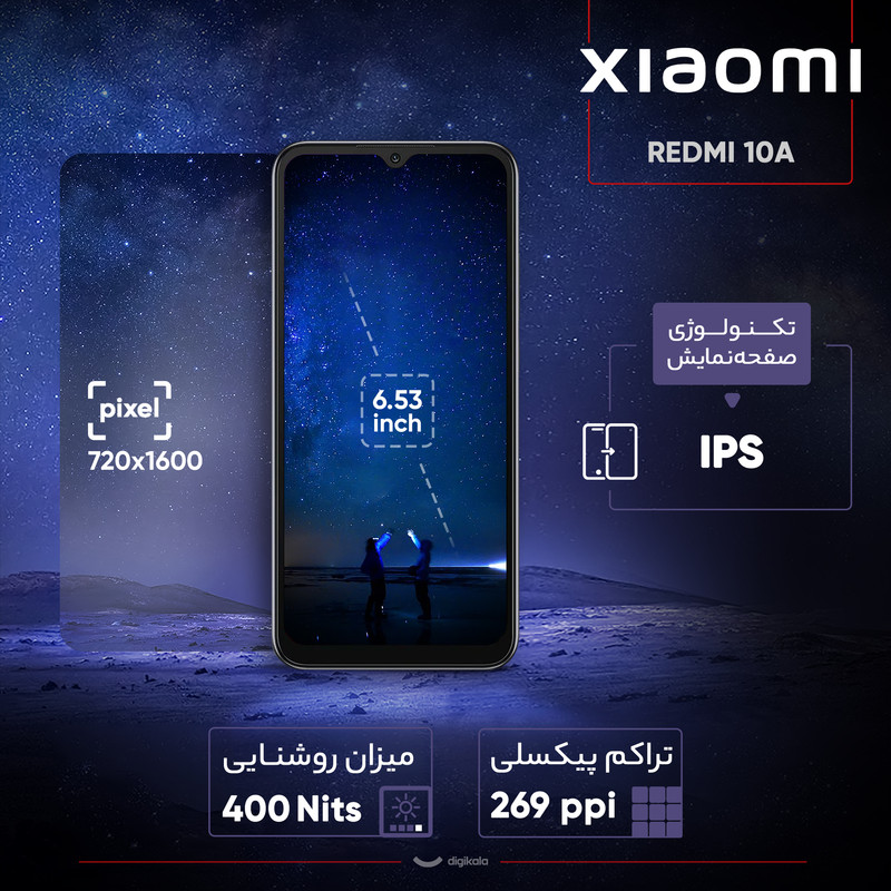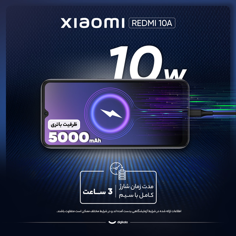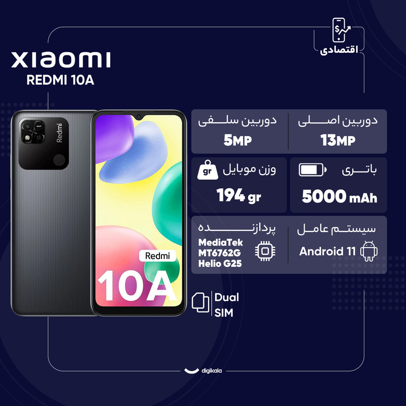 شیائومی REDMI 10A یکی از گوشیهای هوشمند میانرده این شرکت است که به نسبت بسیاری از گوشیهای دیگر موجود در بازار قیمتی ارازنتر و مقرون بهصرفهتری دارد. با توجه به مشخصات در نظر گرفته شده هم عملکرد مناسب و قابل قبولی را از این گوشی شاهد خواهید بود. در نمای روبهرویی به صفحهنمایش با ابعاد 6.53 اینچ و رزولوشن 720×1600 پیکسل از نوع IPS مجهز شده است که توانایی نمایش 269 پیکسل در هر اینچ را دارد. در مورد صفحهنمایش باید بگوییم که وضوح تصویر قابل قبولی را ارائه میکند. در بخش سنسورهای دوربین هم در قسمت پشتی، این گوشی از یک سنسور دوربین اصلی از نوع عریض (wide) با رزولوشن 13 مگاپیکسل مجهز شده است و سنسور دوربین سلفی هم با رزولوشن 5 مگاپیکسل در بریدگی قطرهای شکل ناچ واتردراپ در قسمت بالایی و مرکزی صفحهنمایش قرار گرفته است. حضور پردازنده میانرده هلیو G25 شرکت مدیاتک هم سبب شده تا این گوشی در اجرای بازی و نرمافزارهای کاربردی عملکرد خوبی داشته باشد. باتری با میزان ظرفیت 5000 میلیآمپرساعت عم انتخاب مناسبی است که به ازای هر بار شارژ صد درصدی، توانایی ارائه طول عمر مفید نزدیک به دو روز را در شرایط استفاده معمولی دارد. در مجموع به عنوان یک گوشی اقتصادی، شیائومی REDMI 10A میتواند انتخاب مناسبی باشد.