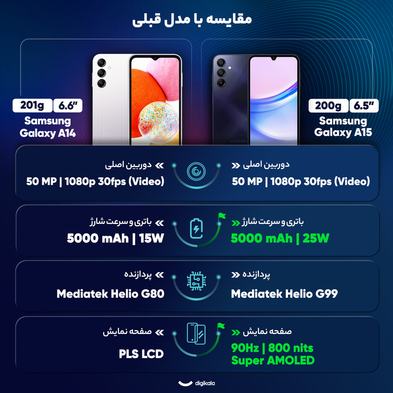 گوشی موبایل سامسونگ مدل Galaxy A15 یک گوشی میان ردهی هوشمند است که با دو سیم کارت قابل استفاده است. این گوشی با ظرفیت ذخیرهسازی 256 گیگابایت و رم 8 گیگابایت، عملکرد قابل قبولی را ارائه میدهد. این محصول دارای طراحی ساده و کلاسیکی با نمایشگر لمسی Super AMOLED 6.5 اینچی است که تجربهی بصری مناسبی را به کاربران ارائه میدهد.